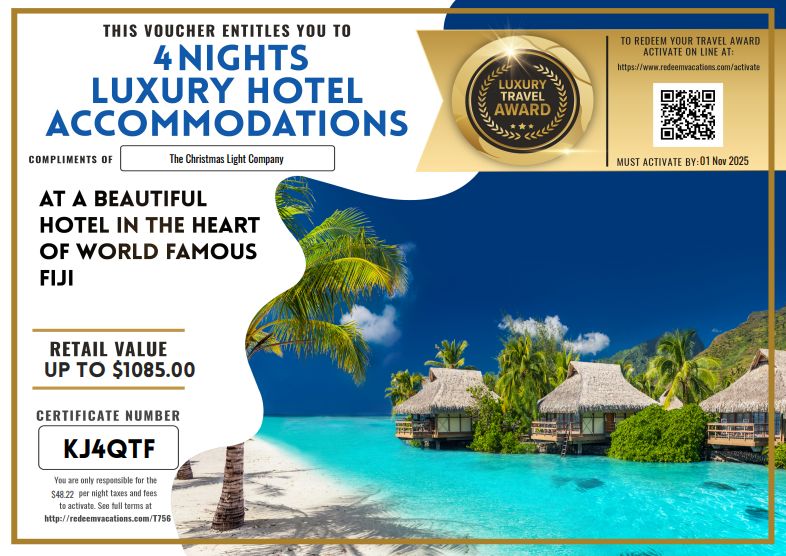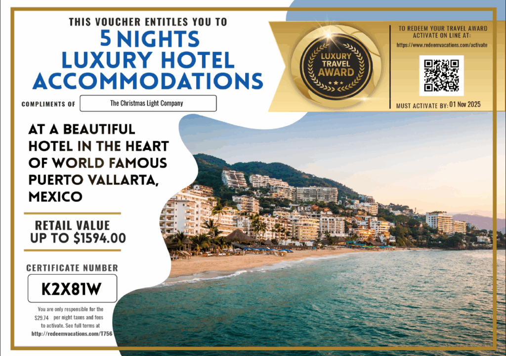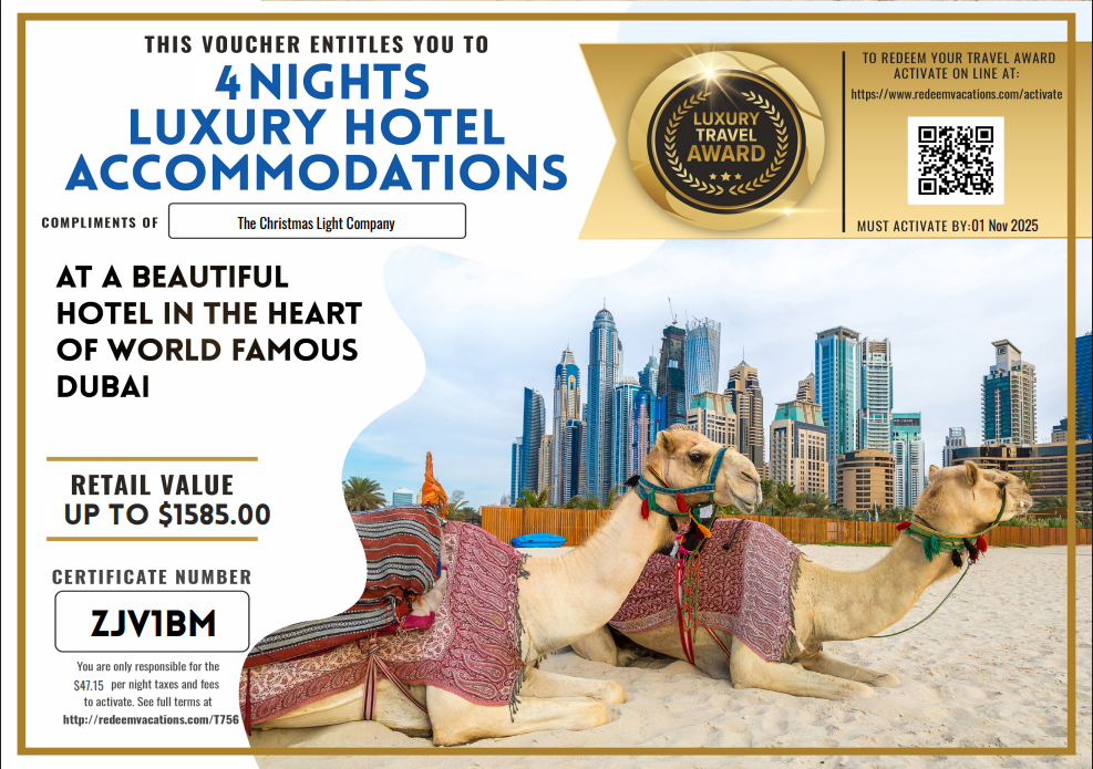 Turn your home into a holiday wonderland with our professional lighting services. Book your installation before Thanksgiving and enjoy a complimentary vacation — choose a luxury hotel stay in the U.S., or an international getaway in a five-star resort. Celebrate the season in style, on us!